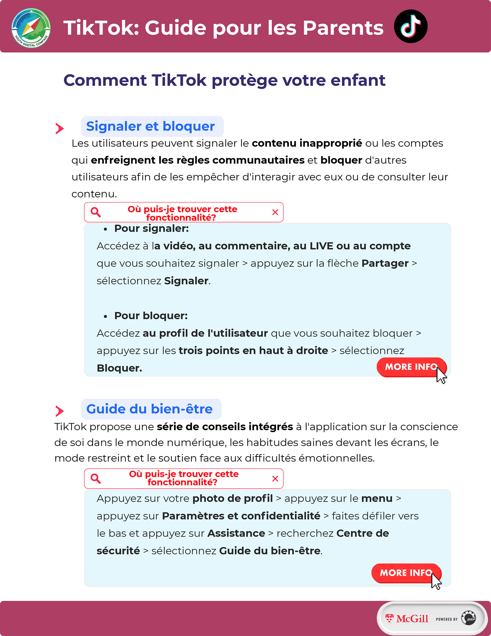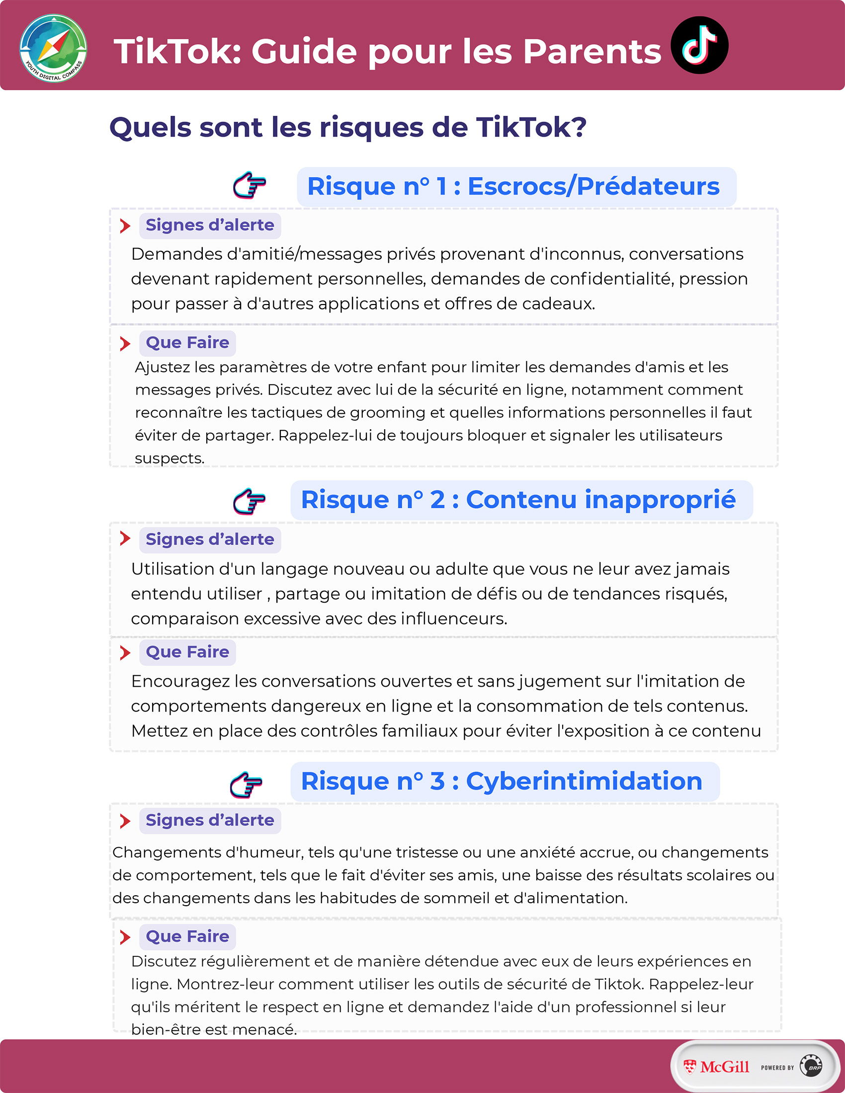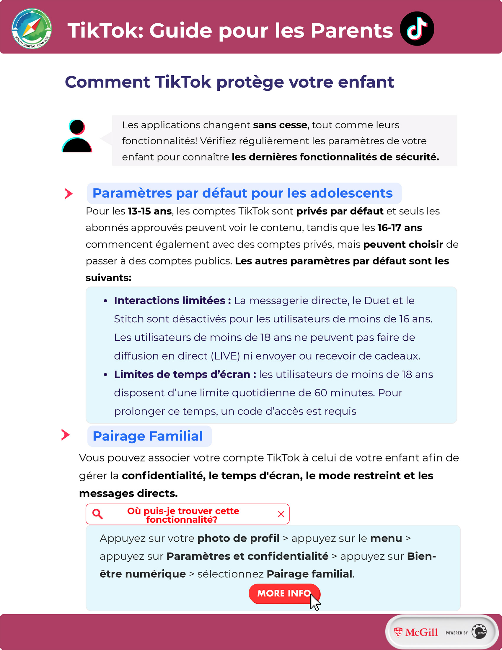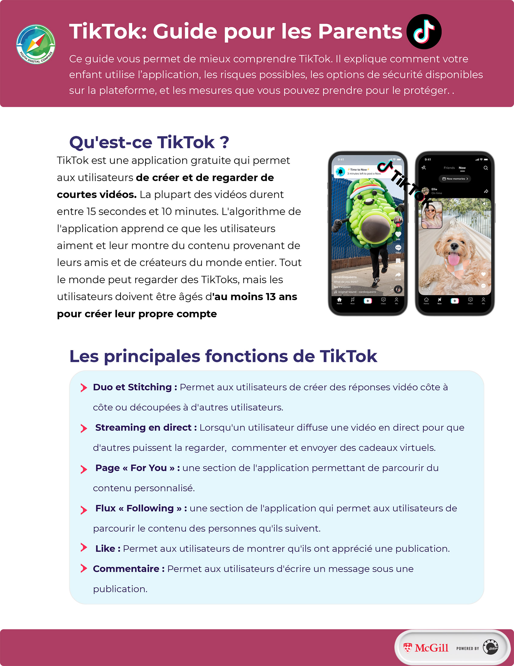 Ce guide vous permet de mieux comprendre TikTok. Il explique comment votre enfant utilise l’application, les risques possibles, les options de sécurité disponibles sur la plateforme, et les mesures que vous pouvez prendre pour le protéger. .