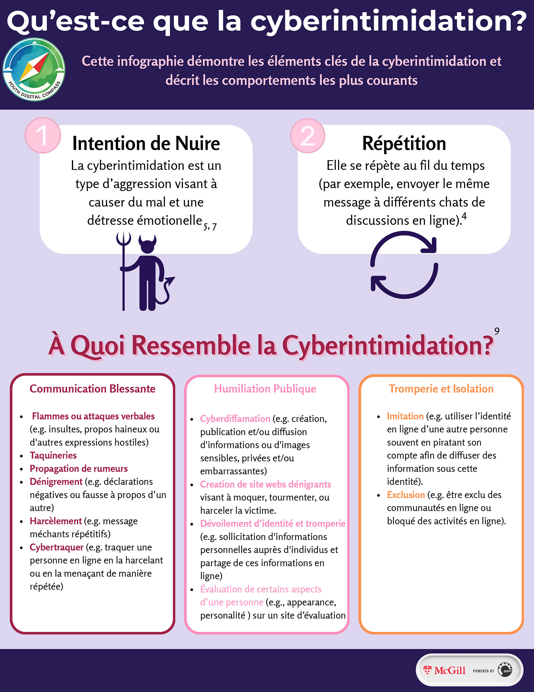 Cette infographie démontre les éléments clés de la cyberintimidation et décrit les comportements les plus courants