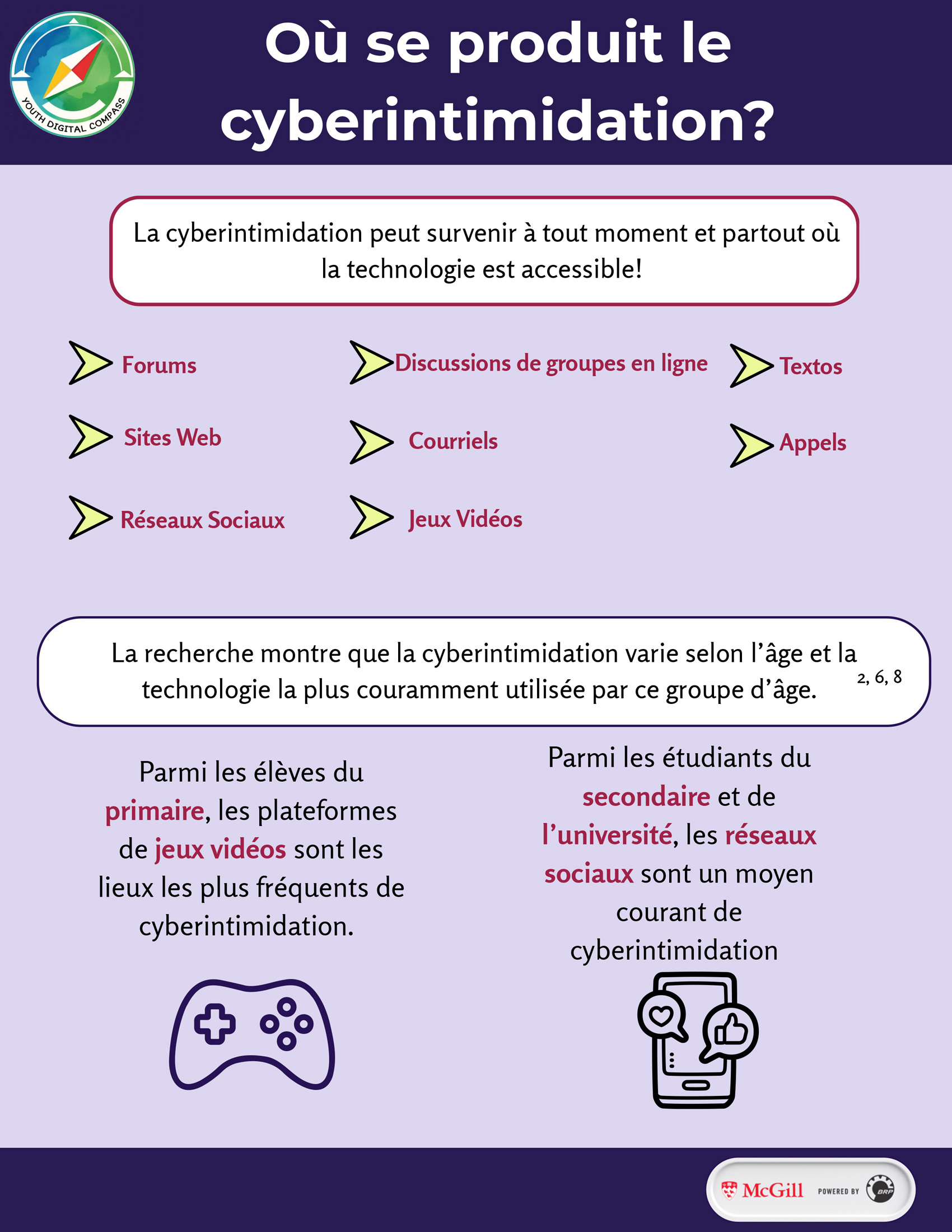 - Parmi les élèves du primaire, les plateformes de jeux vidéos sont les lieux les plus fréquents de cyberintimidation.